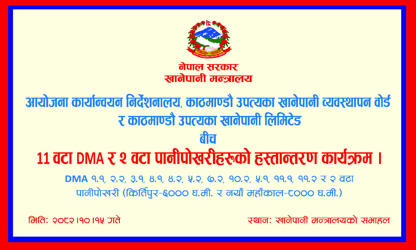 Government of Nepal has accorded a high priority to the task of providing safe and adequate drinking water in an equitable manner to the people of Kathmandu Valley. Residents of Kathmandu valley have been suffering from the hardship caused due to lack of adequate and safe drinking water for a long time.The Government started Melamchi Water Supply Project in December 2000, to solve the chronic drinking water shortage in valley on a sustainable manner.